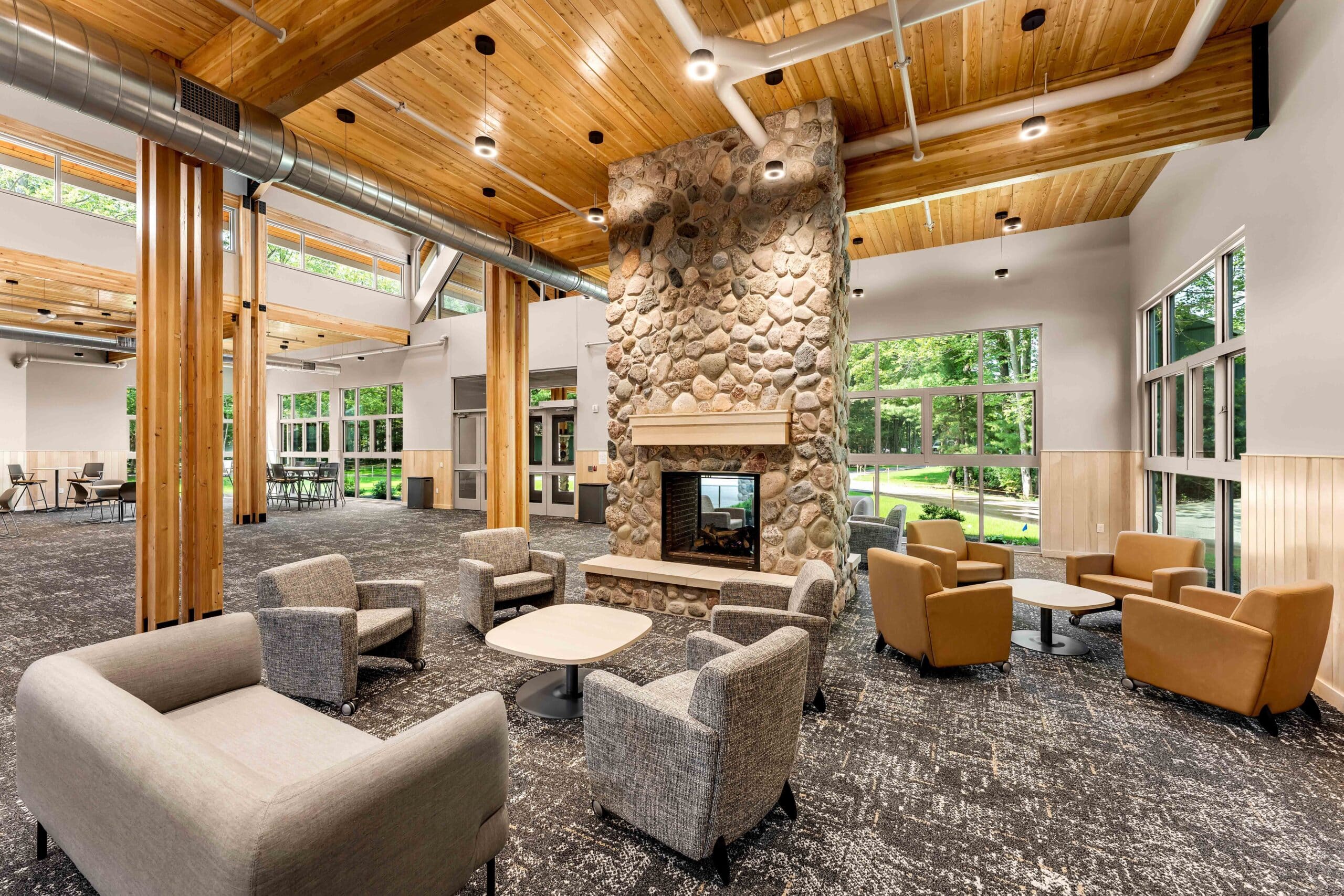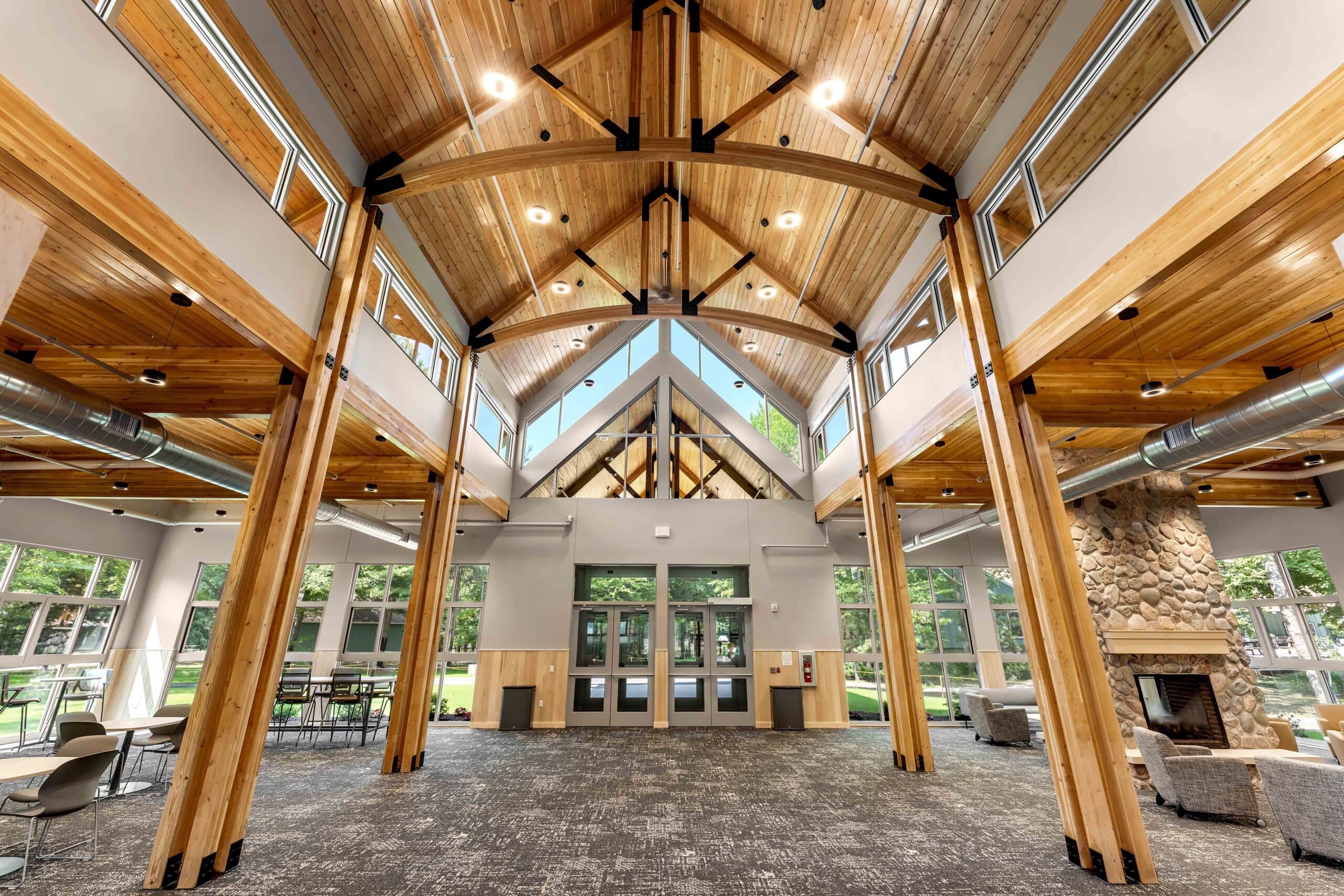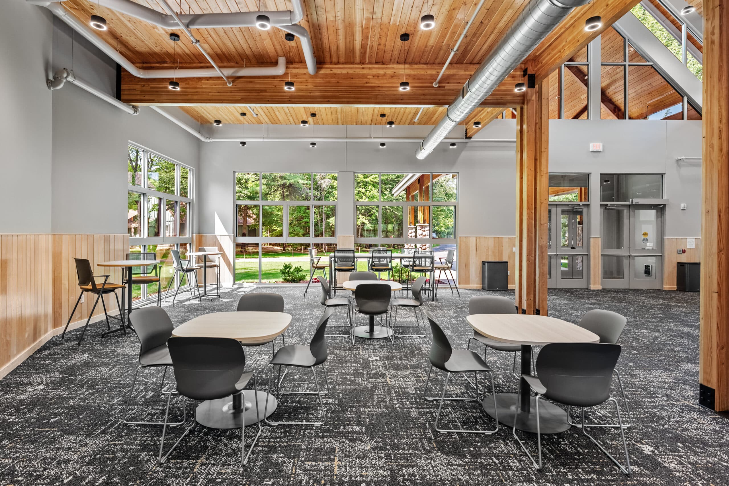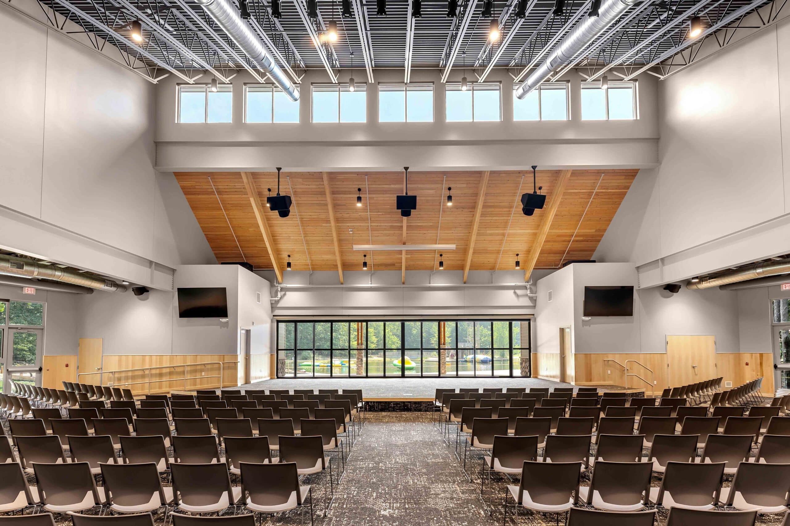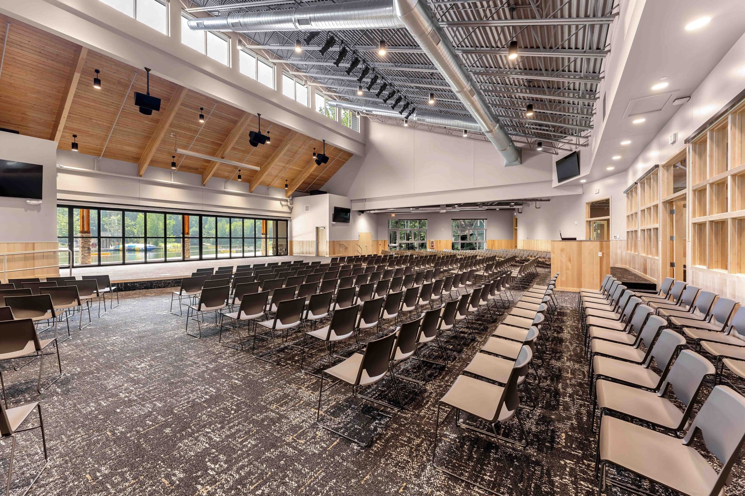 Featuring picture windows, wood finishes, and a spacious lobby, The Woods invites the outdoors in while providing auditorium space for up to 525 people.